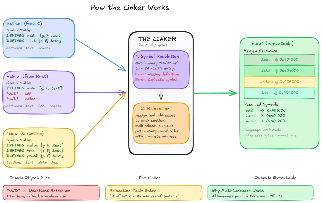 It doesn’t know or care that one object file came from C and another from Rust. It reads symbol tables, matches names, and brings it all together.